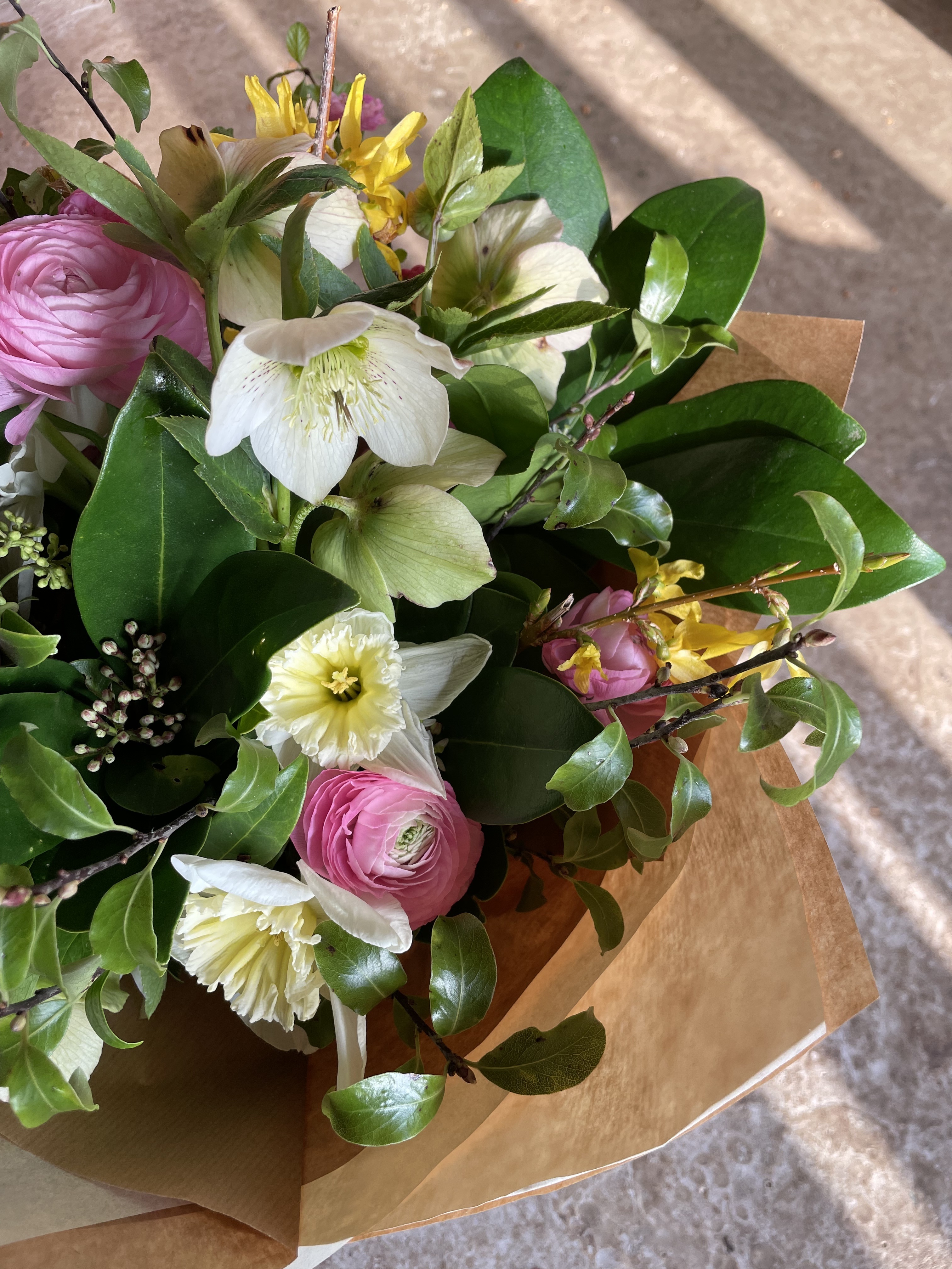 All of our bouquets use British-grown flowers. Because of the seasonal nature of this, we cannot guarantee the exact flower varieties in the photo. The photo represents the colour and style of the bouquet, but we will use the closest similar blooms available at the time the order is placed.